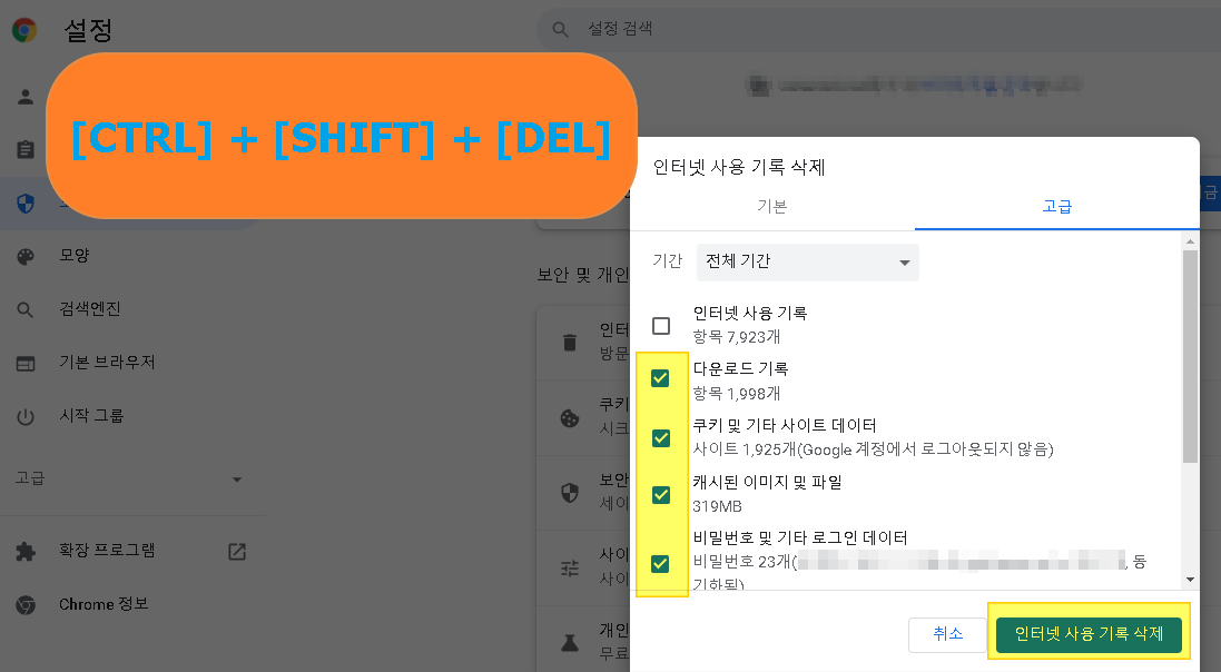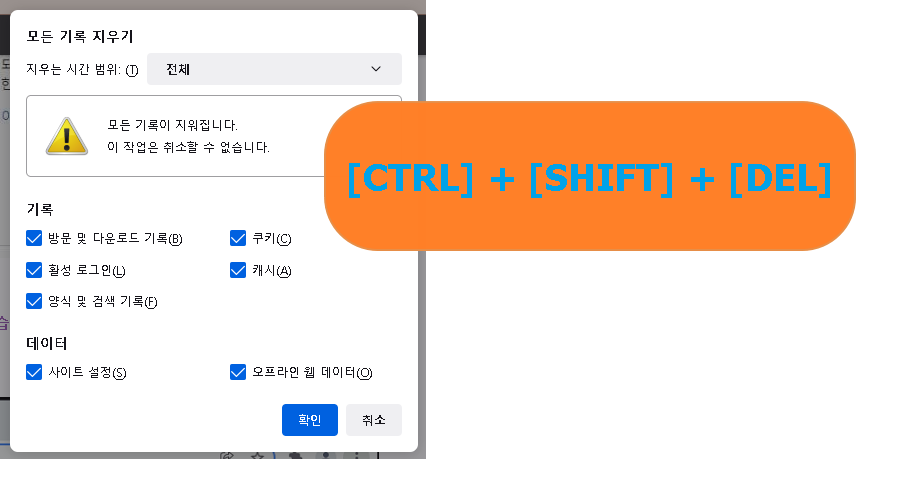 쿠키, 캐시, 비밀번호 데이터 등을 모두 삭제하고,